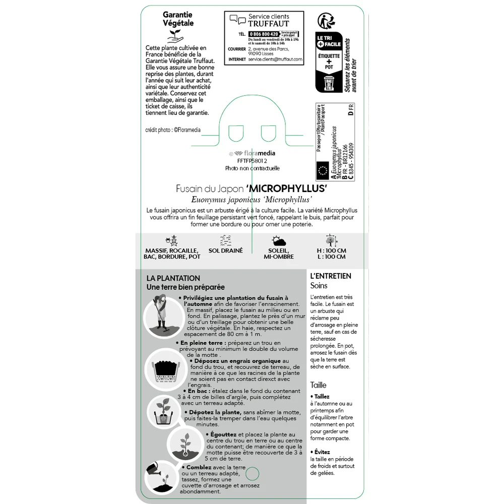 Le genre euonymus ou communément appelé fusain est un genre de plantes appartenant à la famille des Celastraceae. À ce jour ce genre comprend environ 180 espèces d’arbustes ou de petits arbres. Certaines variétés ont un feuillage persistant, d’autres caducs. Ce genre a été décrit pour la première fois par Carl Von Linné (Botaniste suédois) en 1753. Les fusains sont principalement utilisés pour leur feuillage décoratif et leurs jolies couleurs d’automne. Le fusain japonais est une espèce de petit arbuste souvent persistant et au feuillage panaché. Cette variété de fusain dispose d’un joli feuillage panaché et persistant. Il sera idéal en bordure du massif, en rocaille ou bien en bac et potées fleuries.